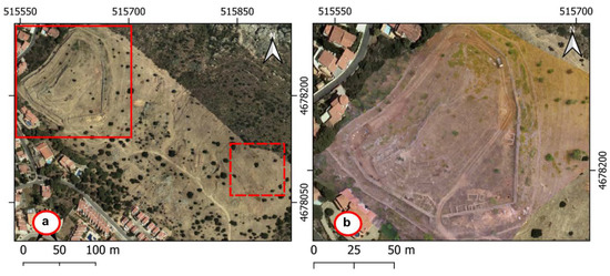 Secondly, we encountered a problem we faced previously when the objects of analysis were multispectral images and SAR-X radar taken from satellite platforms. This problem was the high complexity of the analysed extension, highly affected by the parcel subdivision system in use until the involvement of Alto del Castro as a protected archaeological site (Figure 13b). This parcel division, hidden by the passage of time, and revealed in the analyses carried out, makes it difficult to detect traces corresponding to archaeological structures.