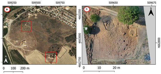 Necropolis of Vilanera (L’Escala, Girona). (a) General view of where the deposit is located. Black box with dashed line: location of the necropolis. Red box with dashed line: analysed area of the monastery of Sta. Maria de Vilanera. Fountain. ESRI World Imagery. (b) Detail of a sector of the necropolis during the 2021 campaign. Flight made with UAV in June 2021. ETRS 89 UTM zone 31 coordinates.