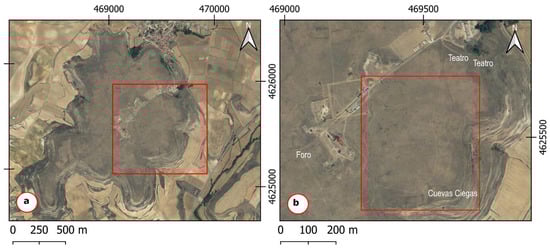 Clunia site. (a) The Alto del Castro. Red box: analysed sector. (b) Detail of the sector analysed between the theatre, the forum, and Cuevas Ciegas. Source: ESRI World Imagery. ETRS89 UTM zone 30 coordinates.