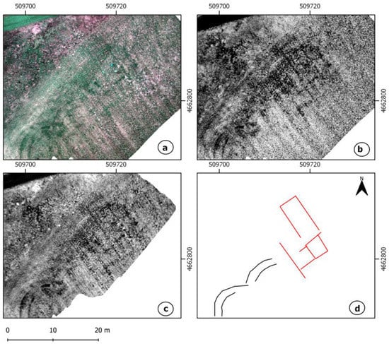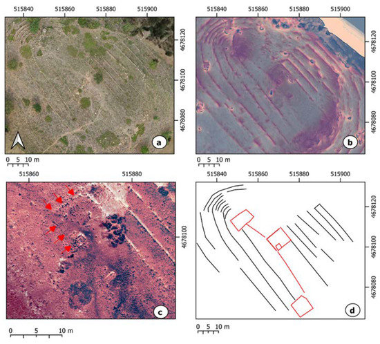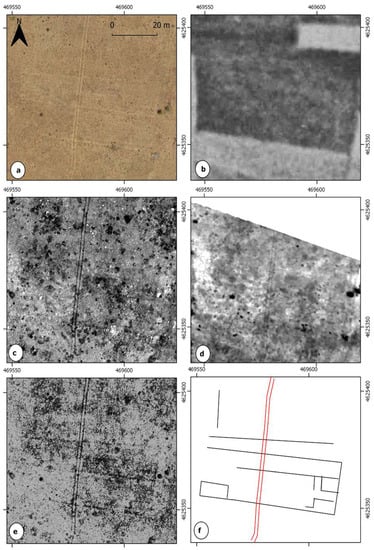 However, as can be seen in the images of the various treatments (Figure 13c–e) and in the interpretation made (Figure 13f), the appearance of transverse marks at the orientations corresponding to divisions subdivided gave the impression of archaeological structures from which the subdividing walls were supported.