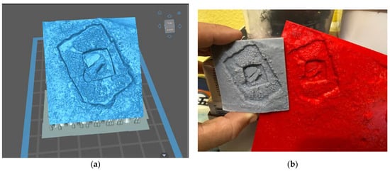 Printouts of the area belonging to the Vilanera site; (a) placement of the piece in the Chitubox rolling mill; (b) comparison between the two impressions made: on the left in resin (grey), on the right in PLA (red). The small deformation in the lower left part can be observed in the resin piece.