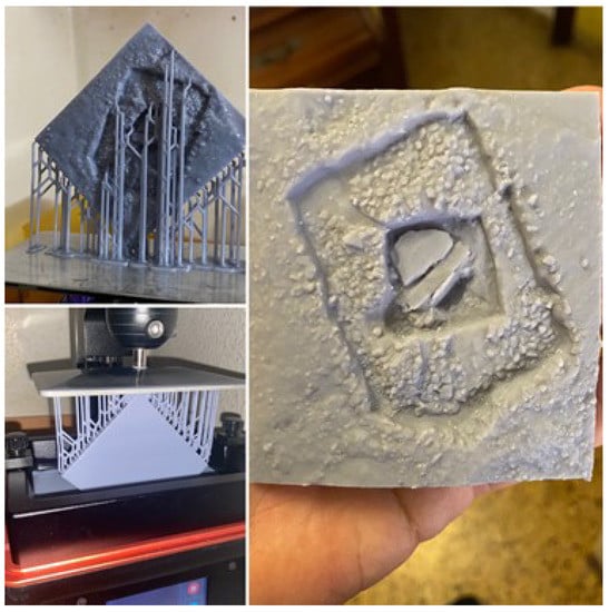 On the other hand, resin printing was also used to duplicate this model and make the appropriate comparisons of time and quality. For this, the size was modified for hardware reasons, and the print was made with a layer height of 0.05. The final print time for the 10 × 5 × 3 cm reproduction was 11 h. As expected, the details in this print, despite its small size, were far superior to the PLA print.