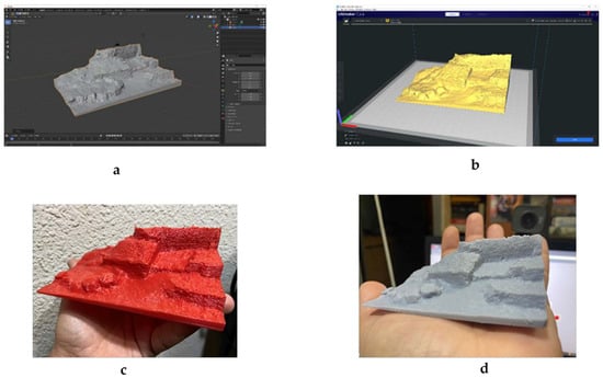 For the treatment of the three-dimensional models obtained through some of the software described in the previous section, we resorted to the free software Blender for the manipulation of the models, in .obj format, and thus obtained a much more orderly geometry without topology errors so as to be able to make 3D prints of some parts of the deposits. For the 3D printing, we removed all kinds of material or generated texture, as it is essential to keep the geometry as detailed as possible. That is why, in the previous step, when moving from the dense point cloud to the mesh, we needed to increase the number of faces in order to have a surface that is much more adjusted to reality, and that is easily interpretable by the different printing formats. The most used are filament deposition (FDM) and resin printing by applying UV light to LCD screens (photocuring).