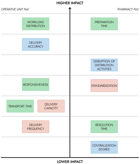 Figure 2, the hierarchy of KPIs is shown: those in higher positions are the ones that are expected to have a greater impact on the users, and consequently on patient care. On the left side, the KPIs with greater impact relatively to the OU staff’s point of view (PoV) were reported, while those having a greater impact on the pharmacy users were reported on the right.
