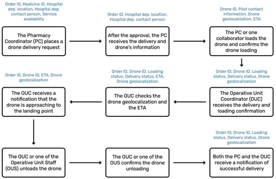 The drone delivery request reaches the FM, who checks the drone’s and RP’s availability and allocates the resources for the operation. A notification confirms the drone availability and identification to the pharmacy manager and their collaborator. The latter reaches the drone base with the ordered drugs and the delivery note, which they load on the delivery container attached to the drone. By using the Drone Delivery App, they confirm that the drone has been loaded.