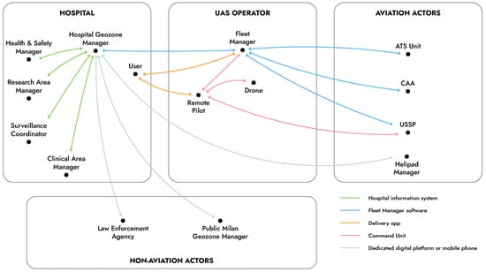 Figure 4 shows the functional scheme of the exchange of information between all identified actors and the components used to achieve such communication, called a UAM ecosystem. Such a digital ecosystem comprises actors pertaining to the large end-user organization of the service (i.e., the hospital), to the UAS operator and also both aviation and non-aviation actors.