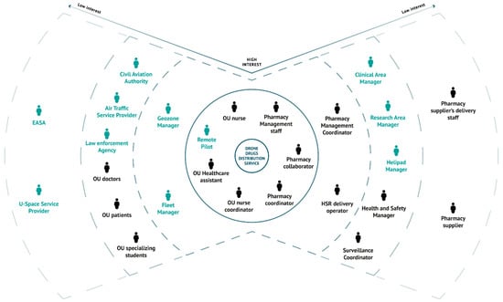 The stakeholders of the pharmaceutical delivery service were subdivided in increasing degrees of interest.