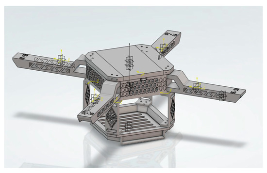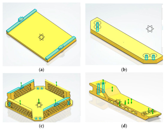 For the center top cover, restraining is performed using a “clamp” at both inner sides of the part as shown in Figure 7a. The two sides will be attached to the middle cover using a snap hook system; therefore, it should be fixed throughout the flight. For the side top cover, restraining is performed using a “clamp” where the four holes at the sides are clamped as shown in Figure 7b. The four holes will be bolted to the middle cover; hence, the degree of freedom should be fixed as it is undesired for the part to move. For the middle cover, restraining is performed using a “clamp” at the eight holes, which are at each of the corners as well as at the side of the middle part that will be connected to the top cover using the snap hook system as shown in Figure 7c. The eight holes will be bolted to the leg bracket and the drone arm as well as the side top cover; thus, the degree of freedom should be fixed as it is undesired for the part to move. As well as that, the sides where the snap hook system is applied are clamped as well because they will be connected to the center top cover.