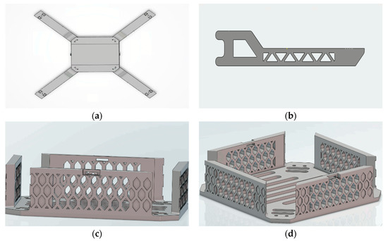 Drone’s Frame Design. (a) Top View of Drone. (b) Drone’s Arm. (c) Cantilever Snap Fit Design for Side Cover. (d) Cantilever Snap Fit Design for Middle Cover.
