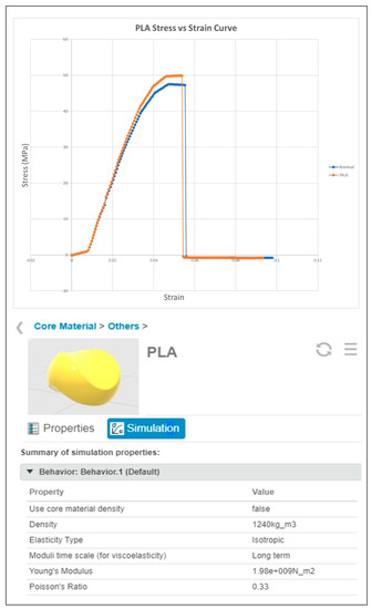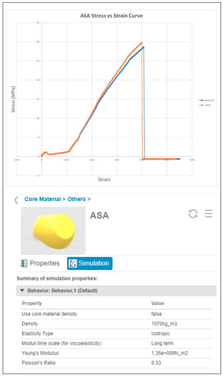 Although the weather and thermal resistant properties of ASA are higher than ABS [30,31], there are a few drawbacks of using ASA. ASA is more expensive, and it has a lower market availability as compared to ABS [32]. On top of that, ASA can be difficult to print as it requires a higher extruder temperature during the printing process; hence, it is harder to facilitate. Since the electronics components used will not produce too much heat, ABS is chosen to be used as it can fulfil the requirements and budget constraints. According to [33], the glass transition temperature (Tg) of PLA is between 55 °C and 80 °C depending on the different types of molecular weight and stereochemistry, while the melting point ranges between 130 °C and 180 °C. Thus, these temperature ranges should be sufficient for the average temperature in Malaysia, which falls within 21 °C and 32 °C [34]. The materials used for the drone are PLA, ASA, and ABS. The materials were defined in 3DEXPERIENCE using the Material Definition App according to the values given in Table 3. However, PLA and ABS material are chosen to be used in the final design of the drone. PLA is used for most parts that need to be denser, stiffer, and stronger, as it can protect the inner part of the drone, while ABS material is chosen to be used for some parts to reduce the overall weight of the drone since it is light but is still much stiffer and can withstand a greater stress before breaking as compared to ASA material. Only the core material is defined because the covering material does not have much effect during the simulation. Figure 4, Figure 5 and Figure 6 show the materials chosen to be used from 3DEXPERIENCE and their stress–strain curves, which show the maximum stress that can be withstood before breaking. On top of that, the maximum stress suggested that the deflection of a part should be less than 4.7 mm, as shown in the setting of the materials using the Material Definition App and their respective stress–strain curves.