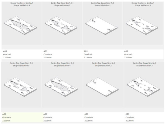For the center top cover, the top four concept shapes generated were compared by performing a trade-off study. The variants that were assessed were the mass, the displacement, and the stress of the part. The mass was given the highest priority; hence, it was set to have a key performance indicator (KPI) of 5. The target of the mass was also set. As well as that, the stress and displacement were given a KPI of 3 as they were less important for this part as it is connected at both ends. As shown in Figure 10, based on the variants and their respective KPIs, the first design scored the highest with a score of 60.3502. However, since this part is supposed to cover up the components inside, it is not suitable for it to have a big hole at the middle of the part. Thus, Centre Top Cover Sim 1 Shape Validation 5, which scored the second highest, was chosen to be the final design since the other variants were still in the acceptable range. For the side top cover, only two concept shapes generated were compared by performing a trade-off study since not much optimization can be conducted for this part.