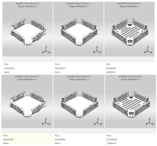 The variants assessed were the mass, the displacement, and the stress of the part. The mass was given the highest priority; hence, it was set to have a KPI of 5. As well as that, the stress and displacement were given a KPI of 3 as they were not that important for this part as it is connected at both ends. As shown in Figure 11, based on the variants and their respective KPIs, the first design scored higher as compared to the second design with a score of 100. Thus, Side Top Cover Sim 1 Shape Validation 2 was chosen to be the final design since the other variants were still in the acceptable range. For the middle cover, the top three concept shapes generated were compared by performing a trade-off study. Similarly, the variants assessed were the mass, the displacement, and the stress of the part. The mass was given the highest priority; hence, it was set to have a KPI of 5. As well as that, the stress and displacement were given a KPI of 3 as they were not that important for this part as it is connected at all corners.