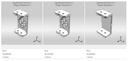 As shown in Figure 12, based on the variants and their respective KPIs, the first design scored the highest with a score of 87.8811. Thus, Middle Cover Sim 2 Shape Validation 2 was chosen to be the final design as all the other variants were in the acceptable range as well. A trade-off study was conducted for the drone arm, where the top four concept shapes generated were compared. The variants assessed were the mass, the displacement, and the stress of the part. The mass was given the highest priority; hence, it was set to have a KPI of 5. As well as that, the stress and displacement were given a KPI of 4 as they were slightly more important as compared to the previous parts because one end of this part is not be clamped to the other parts. As shown in Figure 13, based on the variants and their respective KPIs, the fourth design scored the highest with a score of 90.2502. Thus, Drone Arm Sim 2 Shape Validation 6 was chosen to be the final design as all the other variants of the parts were in the acceptable range as well. For the leg bracket, the top three concept shapes generated were compared by performing a trade-off study. The variants assessed were the mass, the displacement, and the stress of the part. The mass was given the highest priority; hence, it was set to have a KPI of 5. The targeted mass was also inserted. On the other hand, the stress and displacement were given a KPI of 3 as they were not that important for this part since it is connected to both the top and bottom. As shown in Figure 14, based on the variants and their respective KPIs, the third design scored the highest with a score of 54.5. However, the mass of that part differed quite a lot from the targeted mass. Hence, Leg Bracket Sim 3 Shape Validation 2 that scored slightly lower but had a mass that was closer to the targeted mass was chosen to be the final design since the other variants were still in the acceptable range. For the bottom cover, the top three concept shapes generated were compared by performing a trade-off study. The variants assessed were the mass, the displacement, and the stress of the part. The mass was given the highest priority; hence, it was set to have a KPI of 5. The targeted mass was also inserted. On the other hand, the stress and displacement were given a KPI of 4 since they were equally important after the mass.