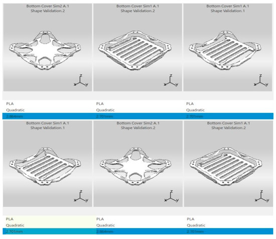 Figure 8 shows the simulation results of the drone frame, which includes the center top cover, the middle cover, the side top cover, and the drone arm. From the results obtained, it is safe to conclude that the drone frame will not fail when it needs to sustain the maximum possible lift force from the motor as well as during the landing process. This is because the Setup Validation showed that the stress and the displacement of the parts were within the accepted range. Furthermore, for the parts that looked bent after going through the simulation, the values were actually very small and insignificant. Figure 9 illustrates the simulation results of the drone carriage that is used to carry the payload, and it includes the leg bracket and the bottom cover. Similar to the rest of the parts in the drone frame, the deformation value was actually very small. For future enhancements, a slight optimization of the center top cover and side top cover can be performed because the parts have a very plain surface, where some unnecessary edges can be removed to reduce the weight of the parts. However, the optimization conducted will just be minimal because these parts will be used to cover up the components inside the drone; hence, it should not have too many holes or else the components may drop out during the flight. Similar to the center top cover and the side top cover, the middle cover can also be optimized, but not by much since this is the part where the components will be placed and it is undesired for the parts to drop off during the flight. As for the drone arm, the part is still very bulky even though a more optimized design is used to start off with. Hence, the optimization process can also be performed for this part to reduce its unnecessary weight.