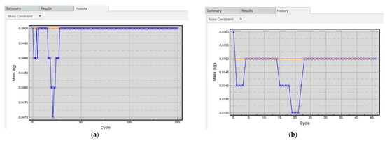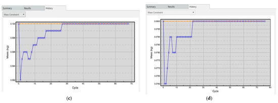 The Centre top cover was set to have a weight of 0.050 kg as shown in Figure 16a. It was set based on the initial assumption, where this part’s targeted weight was at 50 g. The simulation was set to run for 150 cycles to produce the maximum stiffness for a given mass and it was shown that the target weight was reached at the end of the simulation. The side top cover was set to have a weight of 0.015 kg as shown in Figure 16b. This is based on the initial assumed weight, where this part’s targeted weight was at 15 g each. The simulation was set to run for 50 cycles to produce the maximum stiffness for a given mass, where the simulation results show that the weight was suitable for this part and the target weight was reached at the end of the simulation. The execution stopped at the 46th cycle when all the constraints had been met. The middle cover was set to have a weight of 0.1 kg as shown in Figure 16c. The value of the weight was determined based on the initial assumed weight, where this part’s targeted weight was at 100 g. The simulation was set to run for 80 cycles to produce the maximum stiffness for a given mass, where the simulation results show that the weight was suitable for this part and the target weight was reached at the end of the simulation. The execution stopped at the 68th cycle when all the constraints had been met. The drone arm was set to have a mass of 0.8 kg as shown in Figure 16d. Although the initial assumed weight showed that the targeted mass of this part was 30 g, the preserved faces already had a mass of 30 g. Therefore, the system would have to remove everything to reach the target, which is not possible. With that, the target mass was increased slightly to 80 g. The simulation was set to run for 80 cycles to produce the maximum stiffness for a given mass, where the simulation results show that the weight was suitable for this part and the target weight was reached at the end of the simulation. The execution stopped at the 76th cycle when all the constraints had been met.