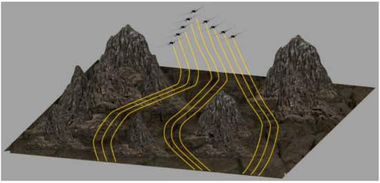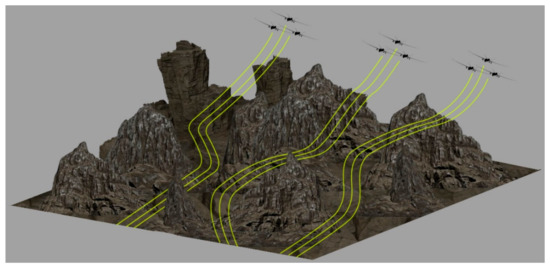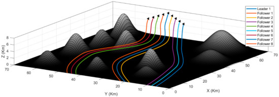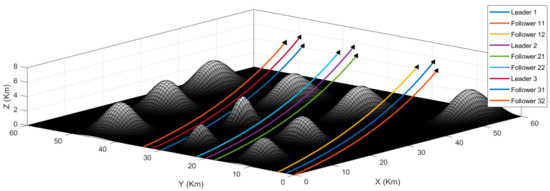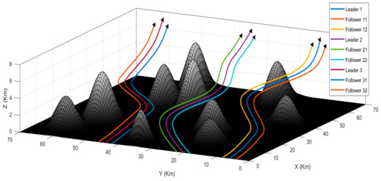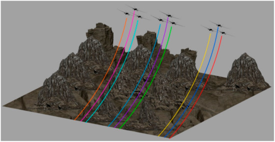 For the first scenario, the UAVs are at random positions within each colony. The objective is to arrange the UAVs into the desired formations and then reach the target using the shortest possible path. Figure 8 presents the simulation result of the first scenario. As we can see, the algorithm successfully arranges the UAVs into formations, and they maintain these formations throughout the journey. The environment contains different obstacles like mountains and rough terrain. Please note that in this scenario, we are only testing the capability of the algorithm to maintain formations, and hence, we fly the UAV formations in an upward trajectory and not through the obstacles. The second and the third scenarios deal with passing the formations through the obstacles.