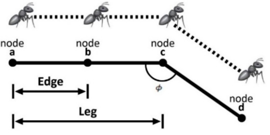 Here, we are using a graph-based approach. The concept of nodes, edges, and legs is important to understand path planning using ant colony optimization (ACO). Figure 5 presents the relationship between the nodes, edges, and legs. The ACO generates intermediary points between the initial and final positions. These intermediate points are called the nodes. An edge is a link between two nodes. For instance, edge (b,c) is the length from edge b to c, whereas a leg is generated whenever a UAV turns.