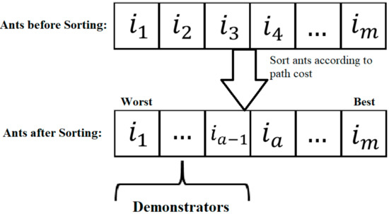 where R represents the map and compass factor, which is between 0 and 1, is the current number of iterations, c1 the learning factor, Xmod the demonstrator ant superior to the current ant, and m is the total number of ants. Each follows the ant better than itself, and this is known as the learning behavior. Figure 6 illustrates the process for the selection of demonstrator Xmod.