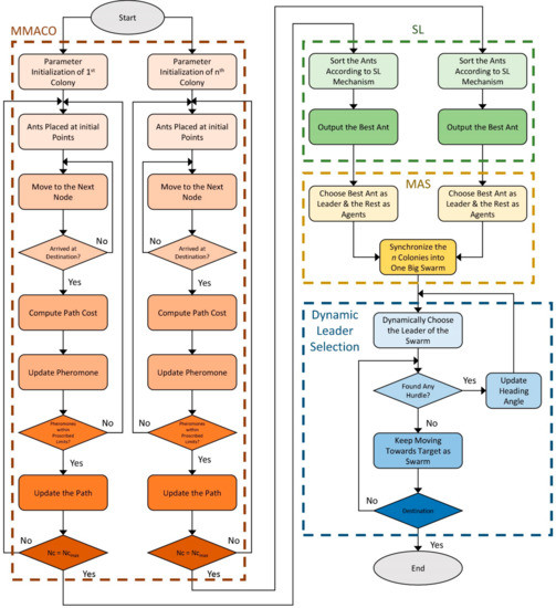 Figure 7 illustrates the flowchart of the whole system. As we can see, the system first initializes the parameters in all colonies and places ants at the starting random positions. Then, the ants keep moving to the next node until they reach the destination. Hereinafter, they compute the path cost and update the pheromone. However, the system only updates the path if the pheromone is within the desired range. This process is repeated for the predefined number of iterations. Next, the social learning mechanism sorts the ants from best to worst according to the path cost, and the algorithm assigns the best ant to be the leader of each colony and the remaining ants to be agents. Finally, all the colonies are synchronized into one big swarm, and the system dynamically selects its leader.