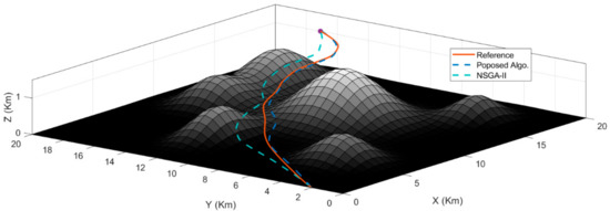 Lastly, we also compare our proposed algorithm with the Non-Dominated Sorting Genetic Algorithm II (NSGA II). We compare our proposed method with the NSGA II because it is a fast multi-objective genetic algorithm and is a highly regarded evolutionary algorithm. Figure 11 compares our proposed method with NSGA-II. Here, we can see that our designed strategy stays close to the reference while NSGA-II sometimes strays too far. Additionally, our strategy follows a shorter and quicker path to the target.