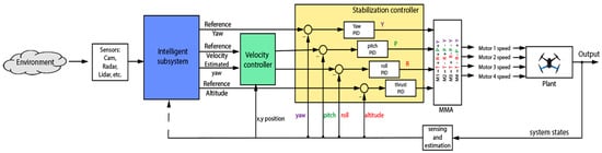17]. MMA transforms the thrust and the signals related to the angles (yaw, pitch, and roll) into suitable control signals. The commands which represent the mission might be prepared offline and stored in an onboard computer to be used in an open-loop form, which needs a well-determined overall system model. Since obtaining a well-determined model is practically hard, mostly the closed-loop form is used based on the available measurements and the estimated state. In a simple path tracking mission, a few waypoints (or landmarks) are chosen in suitable locations to define the path, then they are stored in the onboard computer. During the mission, the drone seeks these waypoints.