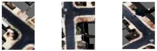 The desired path, which is about 425 m in length, was constructed based on seven waypoints. Each waypoint was connected with a reference template of a size 100 × 100 pixels. The waypoints are located at the center of each reference template and their coordinates in the NED coordinate system were stored. The selection of the templates’ locations was done in street intersections satisfying that each one must contain a long part of the street that appears as two long parallel lines. Usually, the street dimensions are available as public free information on the Internet, they do not need real checks and measurements in the real locations. In the simulation environments, it is easy to do some measurements. Choosing the suitable templates and applying offline preprocessing (enhancement, cropping, and rotating) to them to meet the aforementioned requirements were not hard tasks using the OpenCV library.