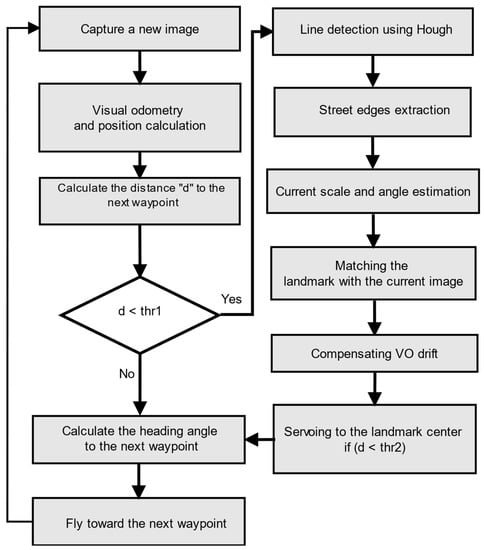 In each time step, the distance to the next waypoint “d” is calculated using the visual odometry navigation system, if “d” is smaller than a threshold equals to “thr1”, then the second mode will start (where the fine landmark matching will take place). When “d” becomes smaller than a second threshold “thr2”, the drone starts to change the current heading angle to a suitable value to fly ahead to the next waypoint. In other words, the “next waypoint” term or variable becomes the “current” one when d < thr2.
