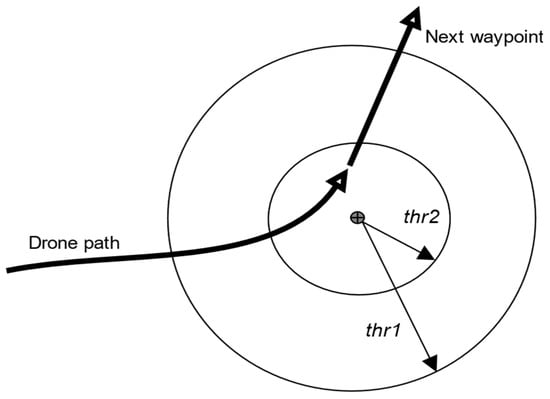 thr2 was chosen to be 1 m, this value represents the accepted error margin for this work, selecting very small values will lead to instability of the drone near the waypoint center. The second operating mode (when