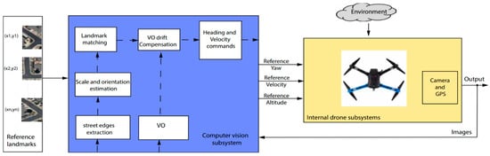 The execution time of the algorithm was 60 ms, and the major part of the time was consumed in the matching process and lines detection. The execution time might be larger than the execution time in some GPS-based methods, but it is more independent and even more accurate when a cheap GPS is adopted. Selecting the street intersections as robust matchings in urban areas, and as well-known structures, proved its efficiency firstly by benefiting from them to estimate the image scale and orientation, and secondly by matching with them which produced a fine and accurate estimate of the drone absolute location. The VO position error grows with time and reaches its maximum value before entering the second fine matching mode. Then, the error starts to decrease near the landmark and falls under 1 m. As more landmarks are used, the maximum position error will decrease, but the task execution time grows because of the velocity control profile near the landmarks and the required image processing time. The suggested behavior of the drone near the waypoint succeeded in reducing the vibration of the drone when it changes its direction. Relying on landmark templates for precise matching and scale estimation was effective since the drone undergoes vibrations in large angles during the flight and direction changing, which affects the ground distance, and hence the captured image scale. Depending on the scale calculation, it is possible to control the drone altitude near the landmark precisely, which would be amazing if it is considered during the path planning before the mission in the future.