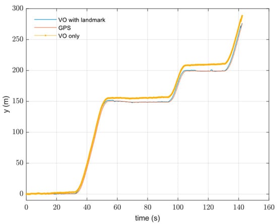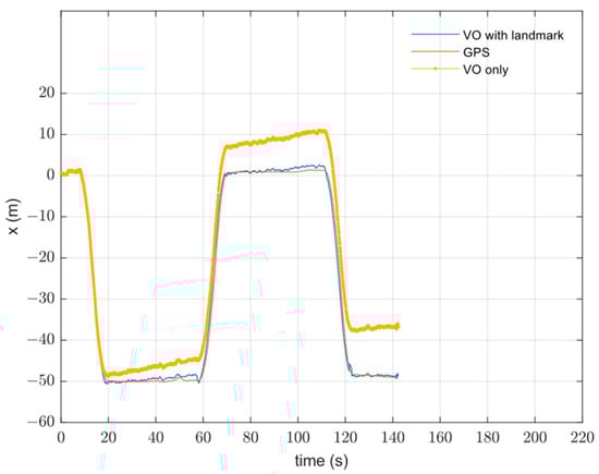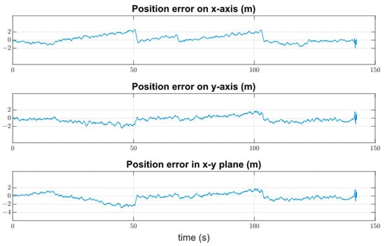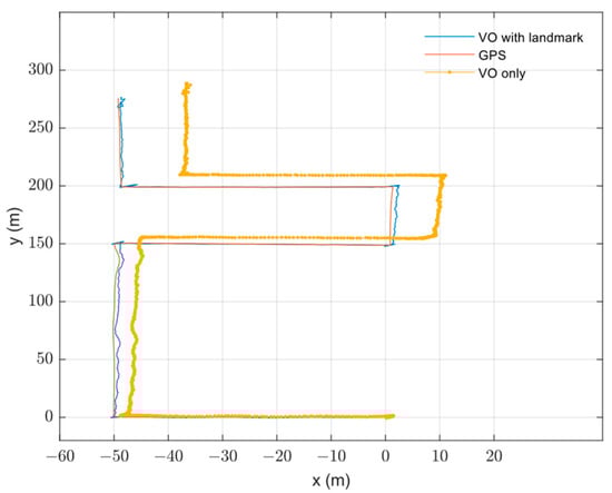 Figure 10. The high position accuracy was obtained close to the waypoints because of the landmark-image fine matching and the fine drone behavior toward the landmark center. A position RMS error of 1.4 m was obtained near landmarks with an average execution time of 60 ms. The mentioned behavior of the drone enhanced the path tracking task. The speed reduction resulted in a reduction of the drone angles vibration around the horizontal axis. As a result, a more accurate matching was obtained from aside, and a fine rotating to the new heading angle. The maximum position error equaled 2.8 m, compared to 14 m with only the VO system without drift compensation, which is shown in the same mentioned figures. The VO will drift until the next compensation; if illogical scale or angle values are obtained, then no matching with the landmark will take place, and the VO will continue drifting until the next waypoint. A deeper solution for fault or failure detection must be derived in the future.
