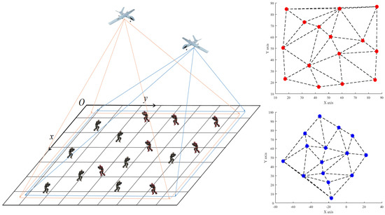 Multi-UAV cooperative technology has advanced rapidly in recent years. UAVs have been widely used in the fields of surveillance [1], reconnaissance [2], tracking and positioning [3,4,5,6,7] due to their superior remote perception capabilities. In the multi-target localization problem, the triangulation method [8] is a frequently used method, which first matches the line of sight of the UAV platform pointing at the target [9]. When the view axis is incorrectly matched, it inevitably leads to incorrect positioning results. In real application scenarios, the limitations of high UAV flight altitude and low sensor resolution add the difficulties to target detection and classification. In particular, targets with relatively similar visual features cannot be distinguished and classified by conventional vision-based detection algorithms. These reasons can lead to a large number of incorrect associations, which can produce incorrect targeting results [10,11]. Due to the importance of multi-target correlation problem in the field of localization and tracking, the multi-target association problem has become a key problem to be solved in the field of cooperative multi-UAV detection [12,13]. The main objective of this work is to solve the association problem of targets with similar visual features, and to propose an association method that does not use the visual features of the targets but only the relative position relationship between the targets to improve the accuracy of association of such targets.