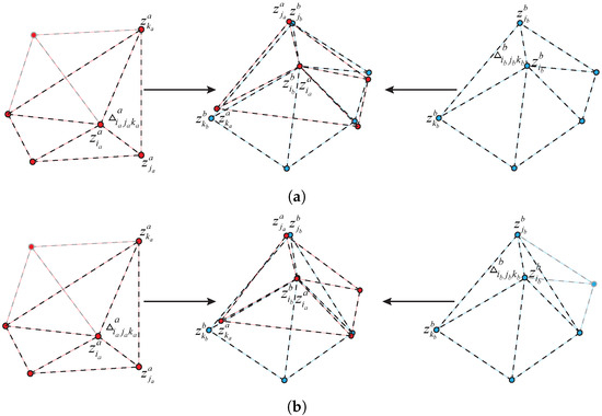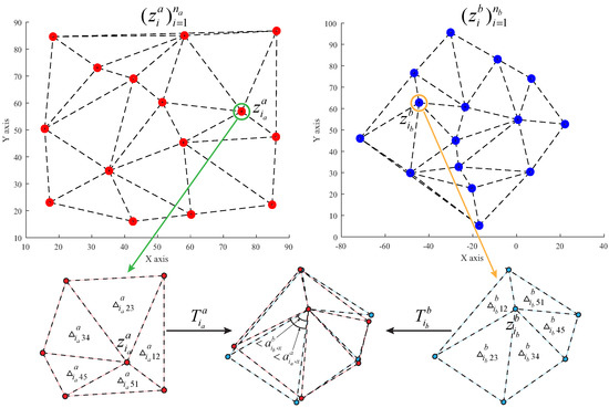 The following topological features are constructed for . Ref. [18] used empirical thresholds to determine neighboring nodes based on their distance, which can be used only within the same coordinate system. This paper employs a method of feature construction that is not dependent on empirical thresholds or coordinate systems. First, Delaunay triangulation [46] is used to create a unique triangular network from . Due to the nature of Delaunay triangulation, which is closest, unique, and regional, each point in the constructed triangular network forms a triangle with only the nearest finite point. When a point is removed from the mesh, it affects only the triangles associated with that point. Due to the uniqueness of the result of Delaunay triangulation and the fact that the similarity transformation does not alter the ratio of angles and side lengths of any triangle in the network, the similarity transformation has no effect on the connectivity of points in the triangular network.