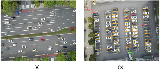 Figure 5 shows the experiments of target detection using yolov5 [44] for UAV vision images in this paper, and the algorithm is fast and accurate for UAV platforms. However, the algorithm also cannot achieve the detection of all targets at all times. Figure 5a shows vehicles moving at high speed on the road, and Figure 5b shows a dense and neatly distributed vehicle in a square, where there are two undetected targets.