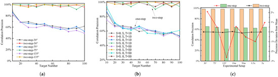 (a) The effect of the number of targets in the region on the correlation precision at three rotation angles; (b) the effect of the number of targets in the experimental area on the correlation precision under different scale transformation and translational transformation conditions; (c) association precision histogram and standard deviation curve of the proposed TTS under various conditions.