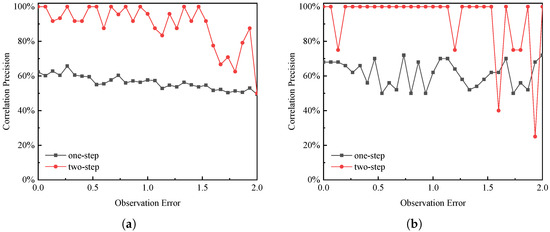 The effect of uniformly distributed observation error on the correlation precision is illustrated in Figure 8. In this paper, we set 31 values of in the range of 0 3 m at 0.1 m intervals and conduct 12 basic experiments used in Figure 6 under each value to study the trend of algorithm association precision with observation errors. Assuming that the size of the target is 1.5 m, the multiplier of the error relative to the target is used for the horizontal axis. Figure 8a depicts the effect of observation error on average correlation precision. When the observation error is less than 1.5 times, the correlation precision fluctuates steadily above 90% with no decreasing trend. When the observation error exceeds 1.5 times, the correlation precision rapidly decreases to approximately 70%, and the fluctuation increases. In comparison, the precision of the single-step correlation was always around 60%, indicating a slowing trend with insignificant fluctuations. Obviously, the two-step correlation algorithm has advantages. Figure 8b illustrates the effect of observation error on the correlation’s precision in one experiment. According to the data in the figure, the two-step association algorithm maintains an association precision close to 100% for observation errors less than 1.5 times, whereas the single-step association algorithm maintains an association precision of around 60%, which is always less than the two-step association. When observation errors exceed 1.5 times, the two-step correlation method begins to exhibit increased fluctuation and the correlation precision decreases further. The experimental results indicate that, while smaller observation errors have a smaller effect on the correlation method proposed in this paper, observation errors greater than 1.5 times have a greater effect on correlation precision, which may be due to observation errors causing estimation errors.
