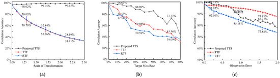 The second section compares TTS’s association accuracy to proposed TTS, RTF, and TTF under the same experimental conditions. We conducted another series of experiments on three different dimensions: (1) certain components are not detected; (2) the error associated with the observation is encoded in the coordinates; (3) the coordinate system of the sensor is scaled differently. The association accuracy variation curves for the three algorithms in different scale sensor coordinate systems are depicted in Figure 9a. Because all three algorithms compared in this paper are rotation and translation invariant, this experiment considers only cases with different scales. According to the experimental results, the correlation accuracy of the current algorithm remains stable at around 98% across a range of scales, whereas the accuracy of the other two algorithms decreases significantly as the coordinate system scales change. This demonstrates that the present algorithm possesses similar transformation invariance to that of other algorithms. Figure 9b illustrates the performance of the three algorithms in the presence of missing targets due to occlusion by a local obstacle. The experiments demonstrate that, as the occluded area increases, the association accuracy decreases. However, the algorithm described in this paper always maintains a high association accuracy, which is on average 19.88% and 27.46% higher than the association accuracy of the other two algorithms. The trend of association accuracy for the three algorithms with varying observation errors is depicted in Figure 9c. The results indicate that, when the observation error is less than 0.73 times of target size, the algorithm in this paper maintains the highest association accuracy. When the observation error is greater than 0.73 times, the results of TTS are lower than the results of TTF. Within the range of observation error distributions of 0 to 2 times, this algorithm’s association accuracy is always greater than that of RTF, by an average of 5.2%. When compared to the data in Figure 9, the TTS algorithm outperforms the other algorithms in all three experimental conditions, and its overall performance is optimal.