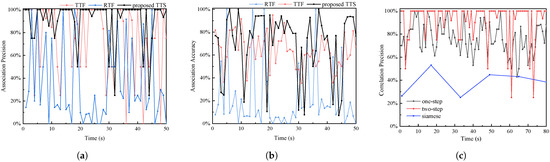 (a,b) is the comparison of the proposed TTS with TTF and RTF in the scene shown in Figure 10a. (c) is precision curves of the association between the proposed TTS and Siamese neural networks in real flight experiments.