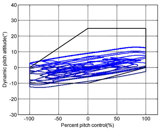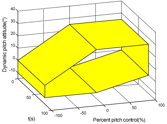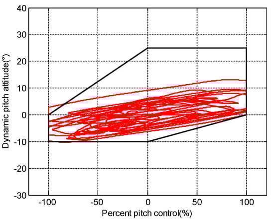 The dynamic-pitch-control envelope can be shown in Figure 1. This envelope defines the relation between the dynamic pitch attitude and pitch-axis control authority. The x-axis represents the percent elevator deflection. The y-axis, that is, the dynamic pitch attitude represents the sum of the current pitch attitude angle and its expected change after one second in Equation (1). It reflects the trend of the pitch attitude angle. It can be used to analyze the prediction of the future states of the aircraft.