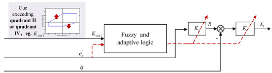 The adaptation module of the human pilot model can be seen in Figure 4 and Figure 5. The initial structure of the module refers to the Hess adaptive human pilot model [34,35,36]. There are two gain parameters Kp and Kr in each control loop of the adaptation module. Here, the envelope cue is separated into two parts: the envelope cue for exceeding quadrant II or quadrant IV and the envelope cue for exceeding quadrant I or quadrant III. Among them, the envelope cue of exceeding quadrant II or quadrant IV will remind the pilot that the aircraft is prone to PIO (as shown in Figure 4). This cue signal is set as Kcue1. In this situation, the human pilot will mitigate the control magnitude and increase the damping. Here, Kp is the control gain of the error signal, which affects the magnitude of the human pilot manipulation. Kr reflects the damping of the inner closed-loop system. Through the analysis of aircraft configuration, Kr decreases with the increase of damping ratio. Therefore, both the inner loop gain Kr and outer loop gain Kp will decrease in the envelope cue exceeding the quadrant II or quadrant IV. Furthermore, the envelope cue exceeding quadrant I or quadrant III will warn the pilot that the manipulation is large and inappropriate (as shown in Figure 5). This cue signal is set as Kcue2. Then the human pilot will reduce the control magnitude, namely, decreasing the outer loop gain Kp.