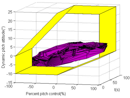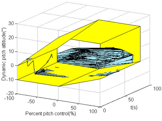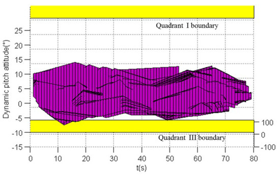 According to the design of the dynamic-pitch-control envelope cue using the pilot–aircraft system model, envelope cue 2 received the best assessment results. In order to validate this design effect, the experimental evaluation results of envelope cue 2 are represented in Figure 36. Three-dimensional evaluation results with time variables can be seen in Figure 37. The projection in quadrant I and quadrant III boundaries is depicted in Figure 38, and Figure 39 reveals the projection in quadrant II and quadrant IV boundaries. It can be seen that the experimental evaluation results are within the envelope boundaries, which reveals the effectiveness of the designed envelope cue.