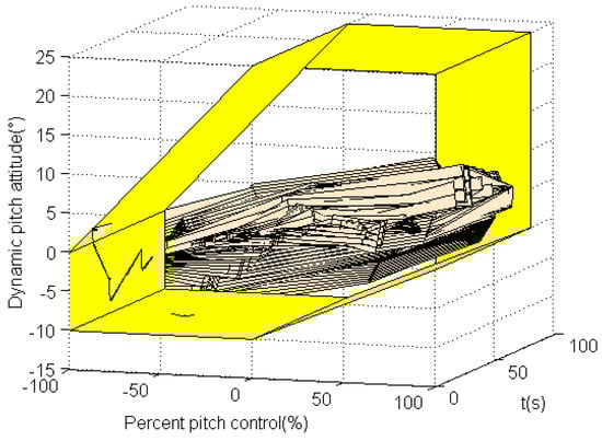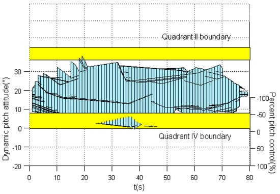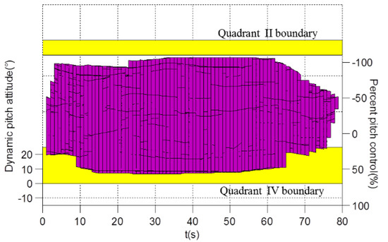 Figure 7 represents the evaluation results without the dynamic-pitch-control envelope cue. It shows that the result exceeds the dynamic-pitch-control envelope boundaries in quadrants II, III, and IV. Three-dimensional evaluation results with time variables can be seen in Figure 8. The projection in quadrant I and quadrant III boundaries without envelope cue is depicted in Figure 9, and Figure 10 is the projection in quadrant II and quadrant IV boundaries. It can be seen that the evaluation result exceeds the quadrant III boundary between 32 s and 51 s. The results exceed the quadrant II boundary at around 20 s and exceed the quadrant IV boundary between 25 s and 41 s.