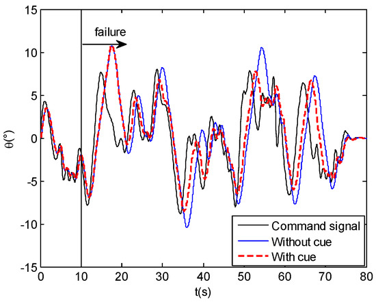 In the simulation, a pitch tracking task is used to verify that the human pilot can track the displayed attitude command and attempt to keep errors within the specified tolerances. Sum-of-sines (SOS) command signals are selected as these force the human pilot to continuously apply control inputs. Failure scenarios are set as the control surface rate saturation is reduced from 100°/s to 10°/s at the time of 10 s. In order to investigate the effectiveness of the dynamic pitch envelope cue using the human pilot model, the related results of the human pilot model and the evaluations of flight envelope boundaries are simulated and analyzed. The simulation results with dynamic pitch envelope cue and without envelope cue are given as follows.