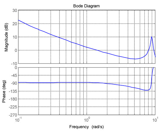 The parameters of the human pilot model are set as follows. In the adaptation module, the initial value of inner loop gain Kr is chosen as the gain value that results in a minimum damping ratio of for any oscillatory mode in the inner closed-loop transfer function . The outer loop gain Kp is chosen to provide a desired, open-loop crossover frequency for the entire pilot model. The nominal value of this crossover frequency will be 2.0 rad/s. Figure 6 represents the bode plot of the open-loop system in the initial state, which indicates that the crossover frequency is 2.0 rad/s. Besides this, the parameters of the perceptual module and executive module in the human pilot model can be found in reference [32].