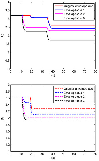When the human pilot obtains the cue of envelope exceeding quadrant II or quadrant IV (Figure 4), the parameters Kp and Kr will change. The changes in human pilot behavior in Kr and Kp (defined as and ) are shown: