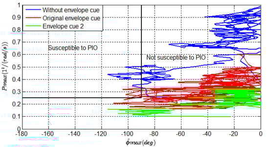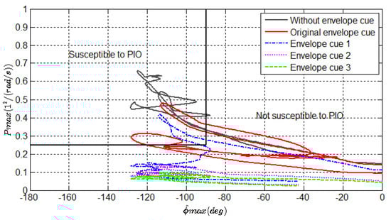 Figure 29 represents the results of the scalogram-based PIO metric applied to different dynamic-pitch-control envelope cues. The prediction of the PIO metric without envelope cue is located in the susceptible PIO region, and the inceptor peak amplitude reached nearly 0.7(12/(rad/s)). Even though the prediction result with the envelope cue still exceeds the PIO boundaries, the inceptor peak amplitude decreases compared with the result without the envelope cue. Moreover, the results of PIO metric prediction with reduced envelope cue 2 and envelope cue 3 are within the unsusceptible PIO region, which reveals the effectiveness of the appropriate envelope cue. These cases’ results agree with the results of the evaluations of envelope boundaries metric.