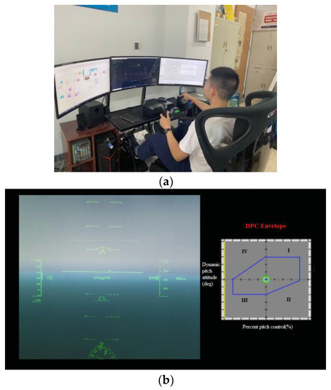 In the pilot-in-the-loop flight simulation experiment, the pilot–aircraft system is shown in Figure 30. The pilot system is composed of the actual human pilot, the aircraft system, and the display interface. The human pilot can perceive the dynamic-pitch-control envelope cue information from the visual display.