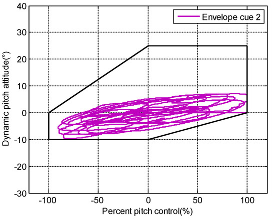 - Based on the pilot–aircraft system analysis, three metrics assessment methods, including error metric, envelope boundaries metric, and scalogram-based PIO metric, are put forward to design the dynamic-pitch-control envelope cues. Note that the error metric reflects the qualities of task completion, envelope boundaries metric, and scalogram-based PIO metric reflect the prediction of adverse aircraft-pilot couplings. The comparison of the simulation and the experiment demonstrated that the assessments are basically consistent. The simulation and experimental results indicate that the evaluations of small boundary cues are easy to maintain within the envelope boundaries and unsusceptible to the PIO region. While if the envelope boundaries are small enough, the quality of the task completion will be reduced. In this study, the flight envelope cue near the place of 90% from the upper and lower boundaries is effective for mitigating the loss-of-control related to pilot-induced oscillations.