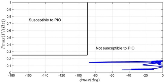 The pilot model simulation results with envelope cues are compared to the result of a pilot model with smart inceptor cues. According to reference [33], the scalogram-based PIO metric result of the smart inceptor cue is shown in Figure 41. Combined with Figure 29, it can be seen that both dynamic-pitch-control envelope cue and smart inceptor cue can mitigate the pilot–aircraft system oscillations. However, dynamic-pitch-control envelope cue via a visual display is easier to implement than the smart inceptor cue via haptic feedback.