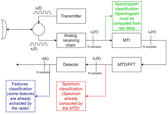 Typical radar chain, composed of MTI, MTD, and CFAR, and related points, in which the spectrogram, spectrum, and features classification can be implemented.