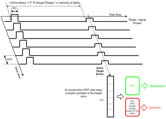 Pictorial view of the radar echoes of a given target and. The radar signal can be folded every PRT and represented on the fast-slow time plane. Fixing the time from the transmitted pulse (fast time) is possible to fix the target distance that we are processing. Collection of the echoes along the slow time is possible to extract a time series representing the same target useful to estimate its spectrum and/or spectrogram.